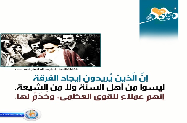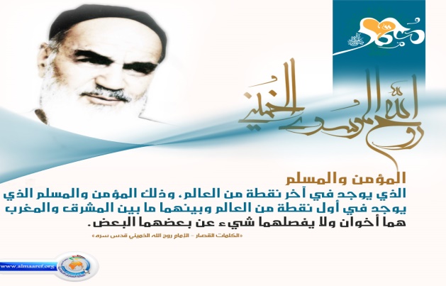 3- الإمام الخميني (قدس سرّه): "إن الذين يدعون الإسلام، ويسعون من أجل زرع الفرقة والتنازع لم يجدوا ذلك الإسلام الذي كتابه القرآن، وقلبته الكعبة، ولم يؤمنوا بالإسلام. إن الذين آمنوا بالإسلام إنما هم الذين يقبلون القرآن ومحتوى القرآن الذي يقول ﴿إِنَّمَا الْمُؤْمِنُونَ إِخْوَةٌ﴾ فيلتزمون بكل ما تقتضيه الأخوّة. تقتضي الأخوة أن يتأثر جميع الإخوان أينما كانوا إذا ألمّت بكم مشكلة، وأن يفرحوا جميعاً لفرحكم"، "من أيّ لسان انطلق الاختلاف، فإن ذلك اللسان لسان شيطان". "الفرقة من الشيطان، والاتحاد ووحدة الكلمة من الرحمن".