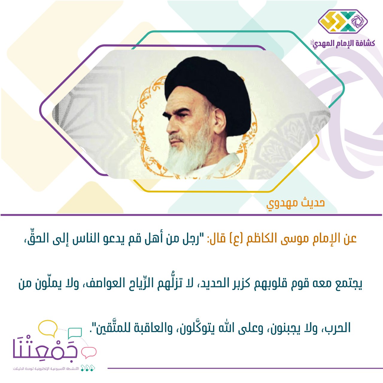 ● حديث مهدوي: عن الإمام موسى الكاظم (عليه السلام) قال "رجل من أهل قم يدعو الناس إلى الحقِّ، يجتمع معه قوم قلوبهم كزبر الحديد، لا تزلُّهم الرِّياح العواصف، ولا يملّون من الحرب، ولا يجبنون، وعلى الله يتوكَّلون، والعاقبة للمتَّقين".