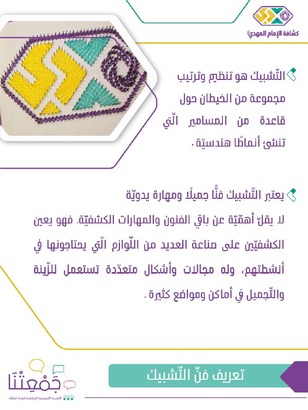 | فن ومهارة | تسأل القائدة ما هو التشبيك؟ وما هي دواعي استعماله؟؟ثم ترسل منشور يتضمن تعريف التشبيك | 6 د |