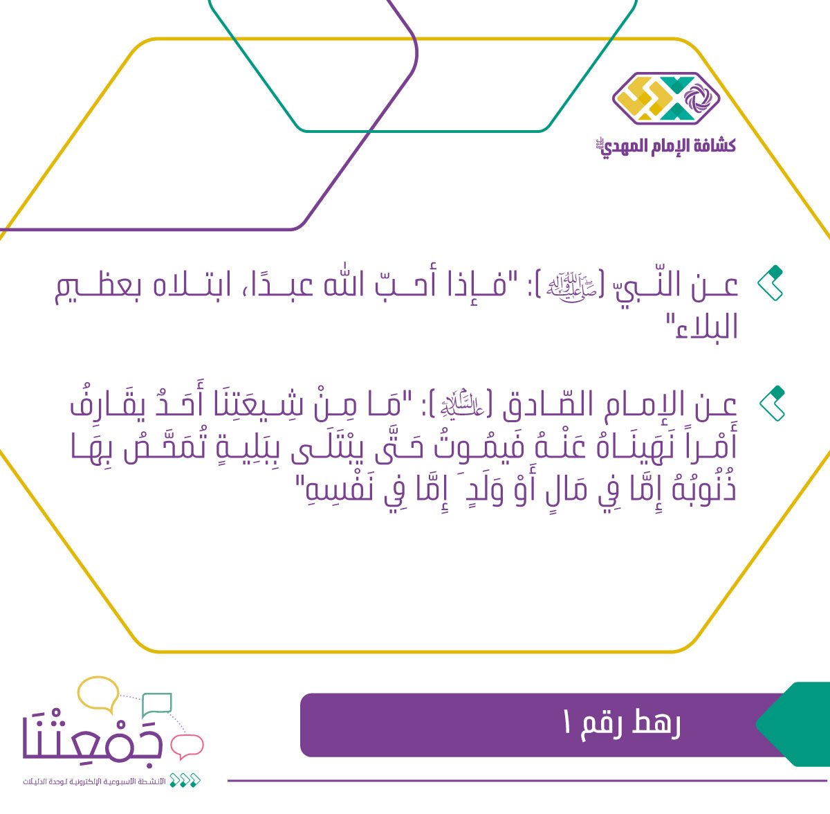 • عرض حديث لأمير المؤمنين (عليه السّلام):"إنّ البلاء للظّالم أدب، وللمؤمن امتحان، وللأنبياء درجة، وللأولياء كرامة."