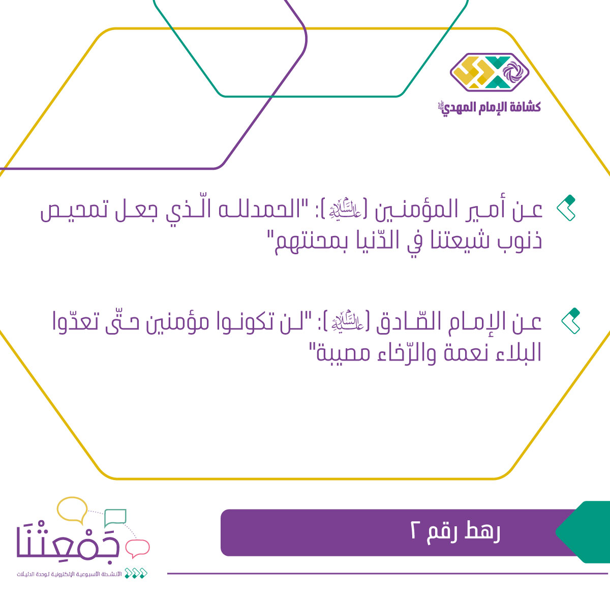 الرّهط الثّاني -عن أمير المؤمنين (عليه السلام): "الحمدلله الّذي جعل تمحيص ذنوب شيعتنا في الدّنيا بمحنتهم"