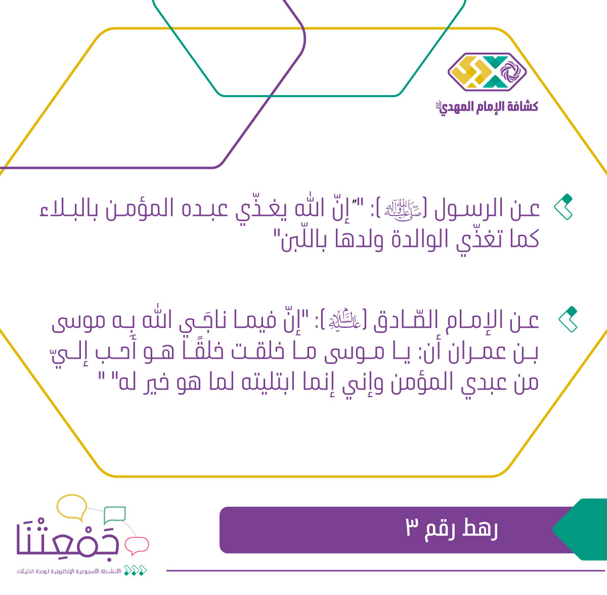 الرّهط الثّالث -قال الإمام الصادق (عليه السلام):"إنّ فيما ناجَي الله بِه موسى بن عمران أن: يا موسى ما خلقت خلقًا هو أحب إليّ من عبدي المؤمن وإني إنما ابتليته لما هو خير له"