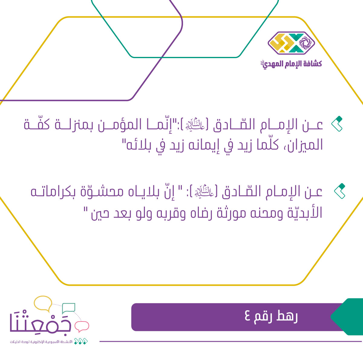 الرّهط الرّابع -عن الإمام الصّادق (عليه السلام):"إنّما المؤمن بمنزلة كفّة الميزان، كلّما زيد في إيمانه زيد في بلائه"