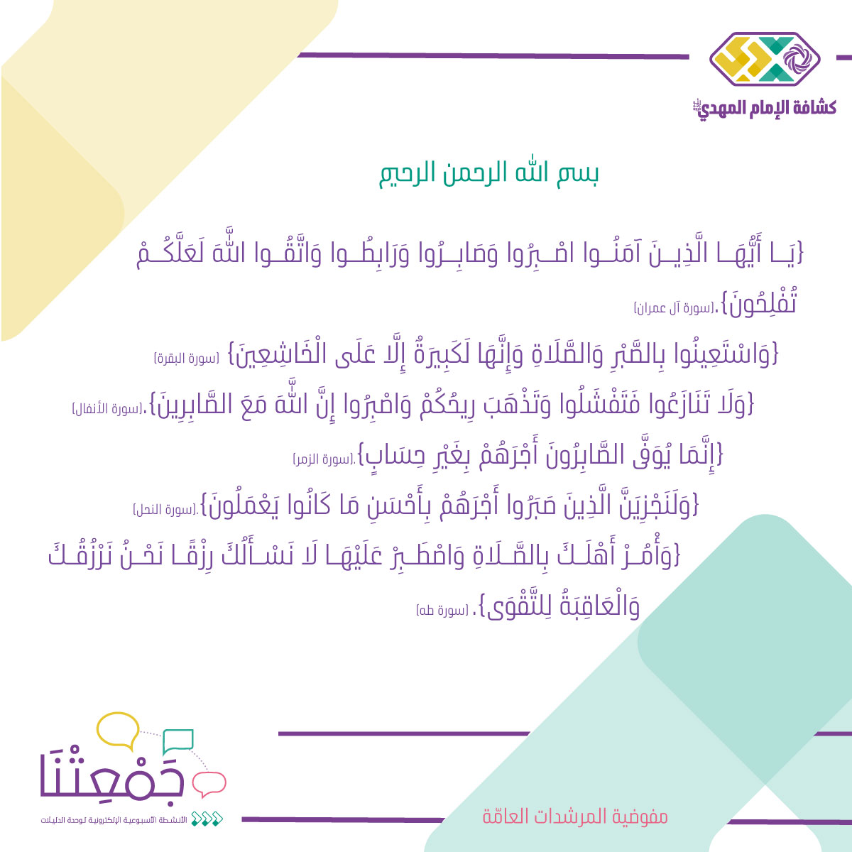 ● قرآن كريم: سورة آل عمران: {يَا أَيُّهَا الَّذِينَ آمَنُوا اصْبِرُوا وَصَابِرُوا وَرَابِطُوا وَاتَّقُوا اللَّهَ لَعَلَّكُمْ تُفْلِحُونَ}./ سورة البقرة: {وَاسْتَعِينُوا بِالصَّبْرِ وَالصَّلَاةِ وَإِنَّهَا لَكَبِيرَةٌ إِلَّا عَلَى الْخَاشِعِينَ}/ سورة الأنفال: {وَلَا تَنَازَعُوا فَتَفْشَلُوا وَتَذْهَبَ رِيحُكُمْ وَاصْبِرُوا إِنَّ اللَّهَ مَعَ الصَّابِرِينَ}./ سورة الزمر: {إِنَّمَا يُوَفَّى الصَّابِرُونَ أَجْرَهُمْ بِغَيْرِ حِسَابٍ}./ سورة النحل: {وَلَنَجْزِيَنَّ الَّذِينَ صَبَرُوا أَجْرَهُمْ بِأَحْسَنِ مَا كَانُوا يَعْمَلُونَ}. /سورة طه:{وَأْمُرْ أَهْلَكَ بِالصَّلَاةِ وَاصْطَبِرْ عَلَيْهَا لَا نَسْأَلُكَ رِزْقًا نَحْنُ نَرْزُقُكَ وَالْعَاقِبَةُ لِلتَّقْوَى}.