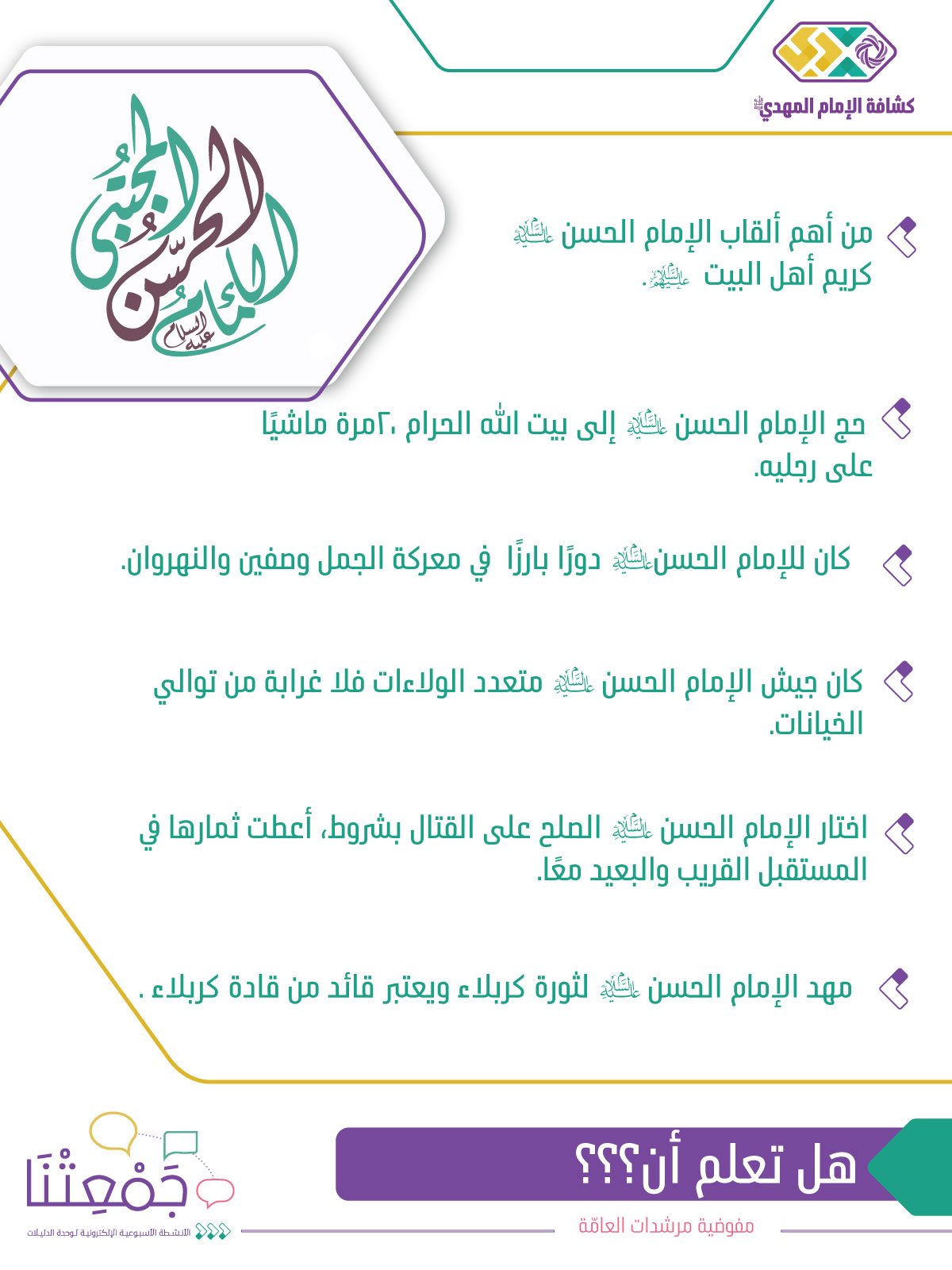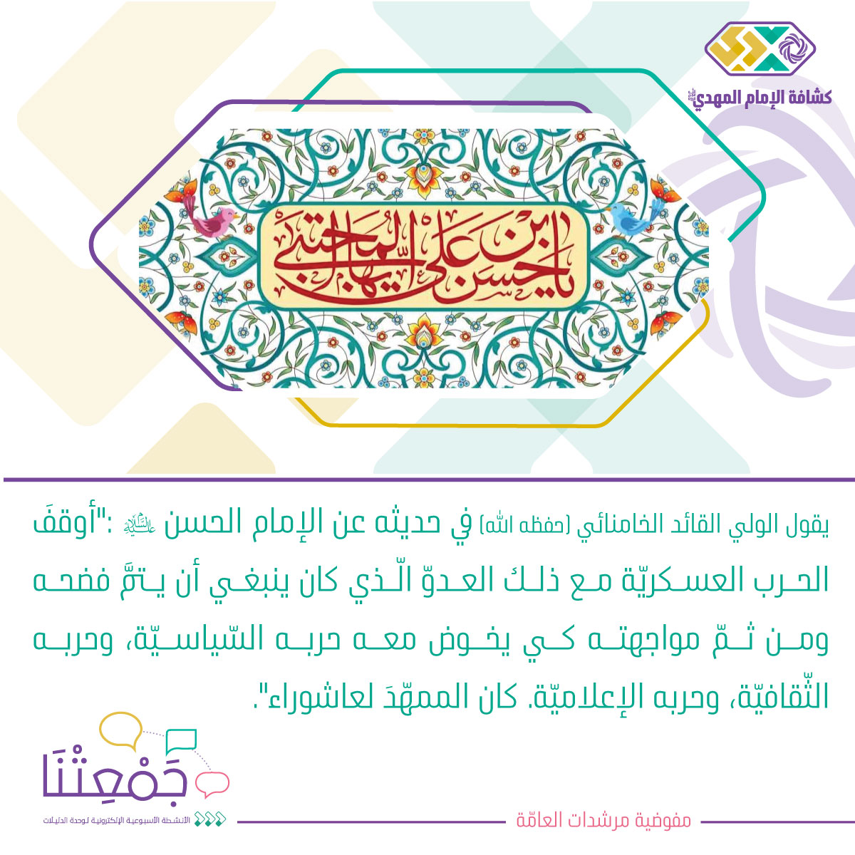 من خلال الآيات المباركة نرى أحبّائي أنّ الله عزّوجل قد أكّد في أكثر من موضع في القرآن الكريم أنّ العزّة هي لله تعالى وللمؤمنين التّابعين لما يريد الله ويرضى. وفي الحديث المهدوي يشير إمام الزّمان عجّل الله تعالى فرجه أنّ الحق هو مع أئمّة الهدى، مع محمّد وآل محمّد عليهم الصّلاة والسّلام وأنّ من يخالفهم ويدّعي بوجود الحقِّ معه هو كاذب. في ورشتنا لهذا اليوم سوف نتحدّث عن جانب من سيرة إمامنا الثّالث، معزّ المؤمنين الإمام المجتبى عليه السّلام.