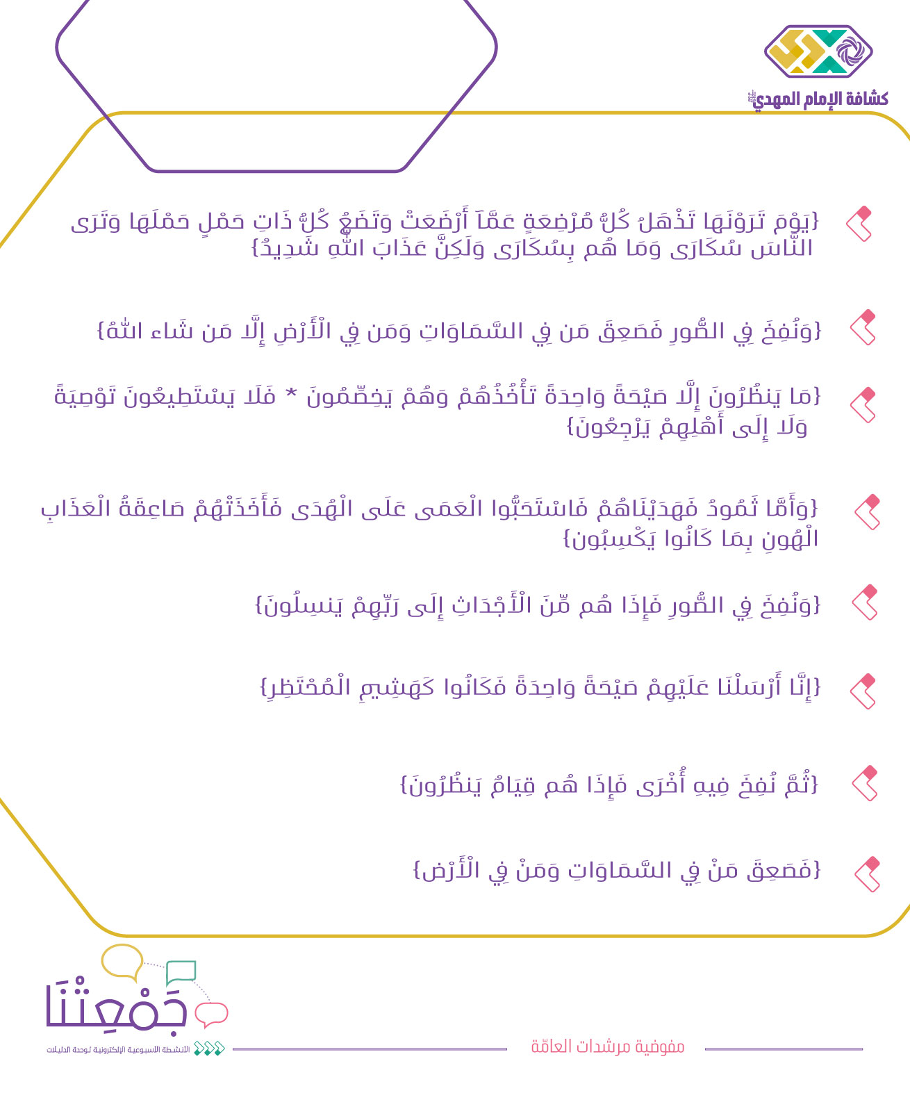 عرض آيات قرآنية وعلى الدليلات استخراج المرحلة الأولى من السفر الطويل وهي "النفخ في الصور" مع تحليل صفاتها+مناقشة |