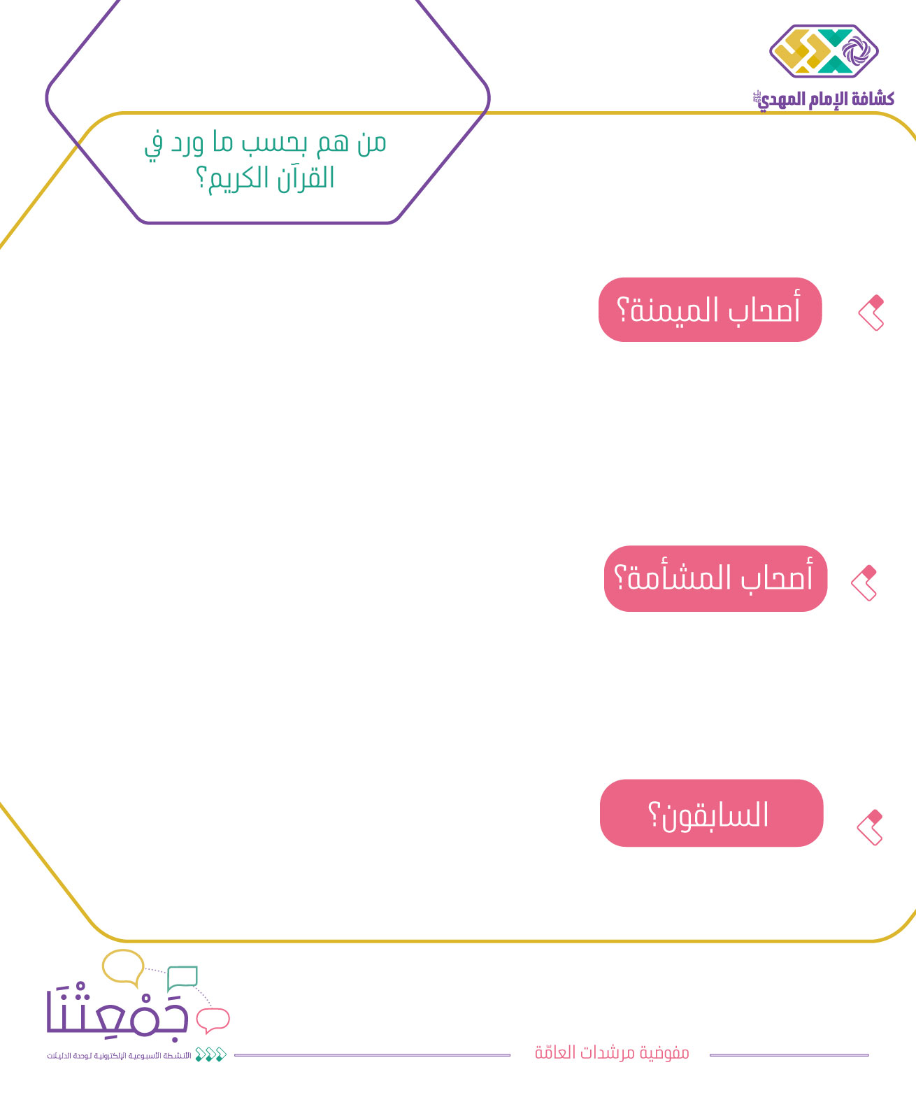 يطلب من المجموعات تحديد من هم أصحاب الميمنة، أصحاب المشأمة، السابقون؟، ثم يتم اجراء نقاش، وعرض مضمون المادة العلمية |