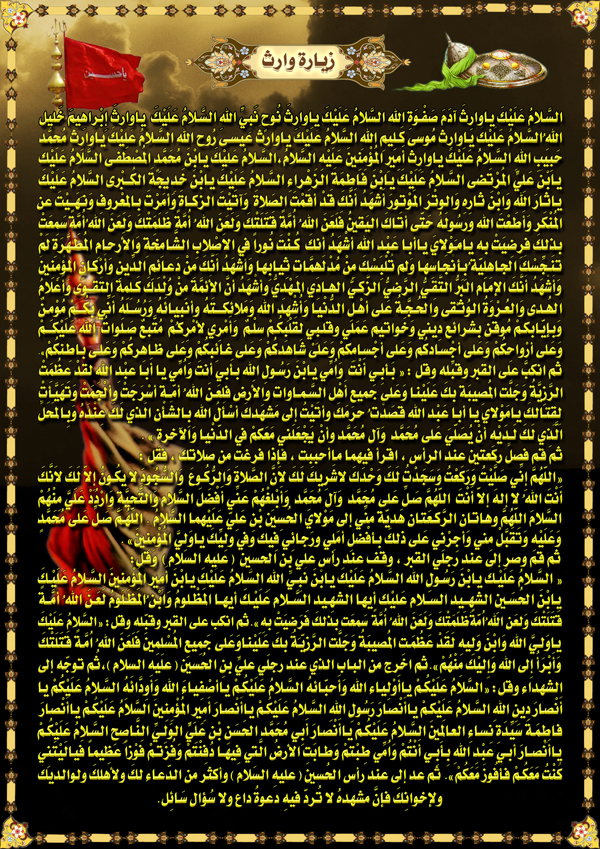 اَلسَّلامُ عَلَيْكَ يا وارِثَ آدَمَ صِفْوَةِ اللهِ اَلسَّلامُ عَلَيْكَ يا وارِثَ نُوح نَبِىِّ اللهِ اَلسَّلامُ عَلَيْكَ يا وارِثَ اِبْراهيمَ خَليلِ اللهِ اَلسَّلامُ عَلَيْكَ يا وارِثَ مُوسى كَليمِ اللهِ اَلسَّلامُ عَلَيْكَ يا وارِثَ عيسى رُوحِ اللهِ اَلسَّلامُ عَلَيْكَ يا وارِثَ مُحَمَّد حَبيبِ اللهِ اَلسَّلامُ عَلَيْكَ يا وارِثَ عَلِىٍّ اَميرِ الْمُؤْمِنينَ وَلِىِّ اللهِ اَلسَّلامُ عَلَيْكَ يا وارِثَ الْحَسَنِ الشَّهيدِ سِبْطِ رَسُولِ اللهِ اَلسَّلامُ عَلَيْكَ يَا بْنَ رَسُولِ اللهِ اَلسَّلامُ عَلَيْكَ يَا بْنَ الْبَشيرِ النَّذيرِ وَابْنَ سَيِّدِ الْوَصِيِّينَ اَلسَّلامُ عَلَيْكَ يَابْنَ فاطِمَةَ سَيِّدَةِ نِسآءِ الْعالَمينَ