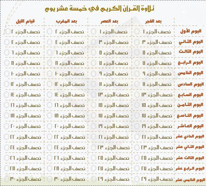 وإليكم برنامج لختم القرآن الكريم خلال 15 يوماً: