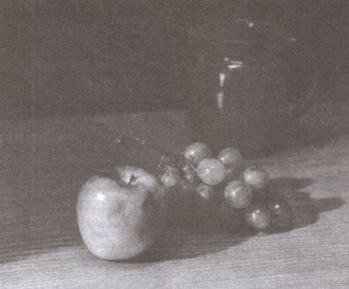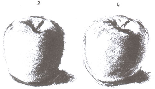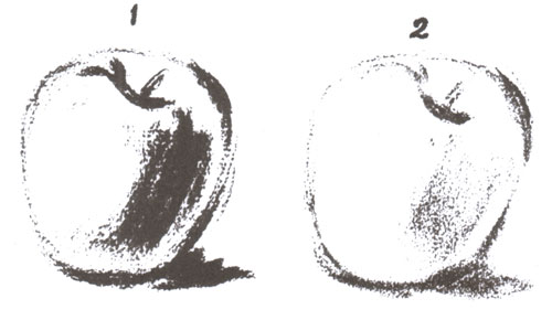-نرسم الظلال في أماكنها, وذلك بدعكها وتسويدها إما بالمدعكة أو بالأصابع كما أشرنا من قبل. ولنتذكر أن الفحم مادة غير ثابتة ولابد من الانتباه, ولنجر التجربة على التفاحة منفردة: