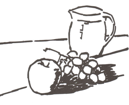 الموضوع: رسم طبيعة صامتة: تفاحة وعنقود عنب وإناء ماء.