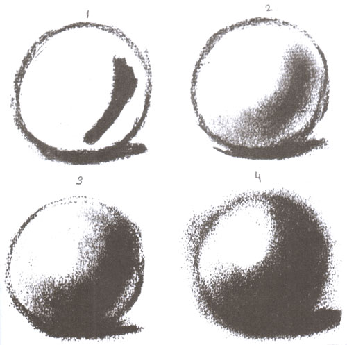 3-لتقوية حدّة الألوان نستعمل مباشرة الفحم دون استعمال المدعكة, وهذا يتطلب منّا ليونة إجمالية ومعبرة عن الرسم بالفحم, ويمكننا القول هنا بأننا لا نستطيع فرض التناسب وعدم التناقض على الرسم بالفحم لا غير وإنما يجب أن ننتبه إلى المحافظة على التناسق ونسب الظل قبل أن نتابع رسم التمرين أو الموضوع الذي اخترناه لابد أن نتدرب أيضاً على ظل الدائرة, نرسم حبّة العنب بعد أن تدربنا على رسم التفاحة. وننتبه إلى الظلال وقيمتها وألوانها والضوء, وتغطية المساحات بالرمادي وتخفيف اللون أحياناً ولنبدأ برسم الكرة ونضع خطاً أسود على منطقة الظلام وندع بؤرة النور بيضاء. ثم ندعك باصبعنا السواد حتى تأخذ شكل الكرة وإظهار البعد الثالث في الكرة ونشبع منطقة الظلال حتى نحصل على لون أكثر دكانة وسواداً ولإظهار التباين ما بين النور والظل وليصبح النور أكثر لمعاناً. ويظهر الشكل كما لو كان كرة دائرية بالفعل توحي بالاستدارة والتكوّر.