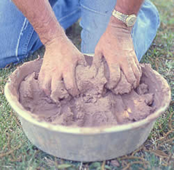 تبدأ العملية عن طريق قص ورق الجرائد أو مجموعة أخرى من الأوراق (ويفضل غير الملون) إلى قصاصات متوسطة الحجم وتنقع بالماء (من الممكن أن يكون الماء ساخناً لتسريع العملية) لمدة 24 ساعة. من ثم توضع في وعاء معدني كبير وتغلى على النار لمدة لا تقل عن ساعتين بعد أن نضيف عليها القليل من "السبيرتو الأزرق" لنخفف قدر الامكان من المواد والروائح الغير مفيدة. بعد ذلك تصفى من الماء في مصفاة وتعجن الورق بالأيدي إلى أن يصبح المزيج متجانساً نوعاً ما, بعد ذلك نضيف كمية مناسبة من الغراء عليها وتعجن مجدداً حتى يختلط الصمغ مع الورق جيداً.