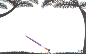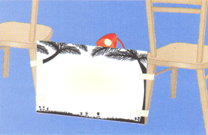 1. لصنع الشاشة، نأخذ ورقة كبيرة بيضاء، أو قطعة من القماش الأبيض الشفاف، ونرسم على جوانبها باللون الأسود بعض جذوع أشجار النخيل.