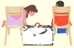 9.لتأدية العرض، نحرّك الدمى للأعلى والأسفل، سوف يتمكن الجمهور من مشاهدة ظل الدمية على الشاشة.