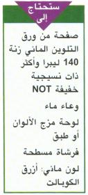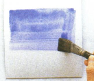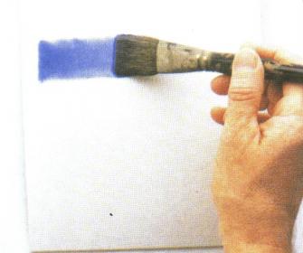 2- نسحب الفرشاة عبر الورقة. نترك الورقة لمدة دقيقة إلى دقيقتين حتى تمتص الماء، في غضون ذلك نسكب بعض الماء في لوحة الالوان أو في صحن أبيض، و باستعمال فرشاة مبللة، نمزج معه بعضاً من صبغ أزرق الكوبالت. نتأكد من مزج صبغٍ كافٍ لإكمال الطلي، ثم نسحب الفرشاة المغمورة بالمزيج فوق أعلى الورقة بضربة مفردة ناعمة متعادلة ضاغطين بشكل متعادل على امتداد مسار الطلي.