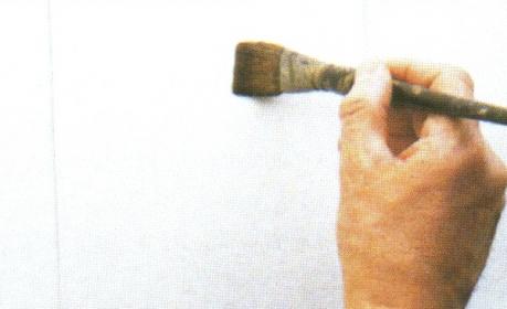 3- نستمر في التحرك للأسفل. في نهاية الضربة، نرفع الفرشاة، و نكرر العملية مباشرة تحت مدّ الطلاء الأول - معيدين غمر فرشاتنا بالصبغ إذا احتاج الأمر- و نتأكد من عدم ترك فجوات بين ضربة الفرشاة الجديدة و تلك التي تعلوها. نستمر في التحرك لأسفل الورقة بنفس الطريقة محافظين على ظغط متعادل من الأول إلى الآخر.