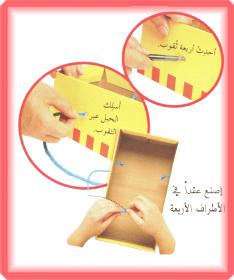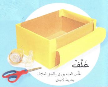 نغلف العلبة بورق و نلصق الغلاف بشريط لاصق،(بإمكاننا أن نلصق على العلبة صوراً من مجلات أو أن نرسم صوراً بأنفسنا)