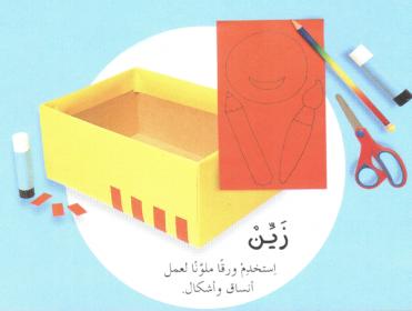 نزين: نصمم نسقاً لغطاء العلبة، نرسمه على ورقة، و نلصق الورقة على الغطاء بواسطة الغراء