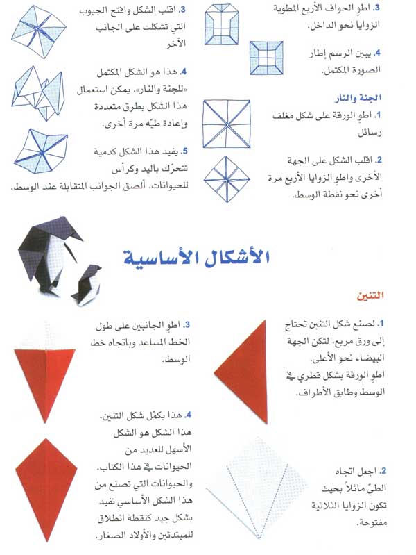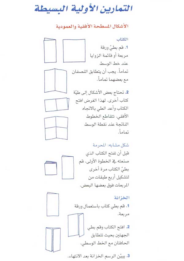 إن كل الأشكال في هذا الكتاب سوف تصنع من ورق مربع. يجب أن تكون الجوانب الأربعة بنفس الطول (بدقة لا تتجاوز المليميتر الواحد) و متطابقة الزوايا تماماً.