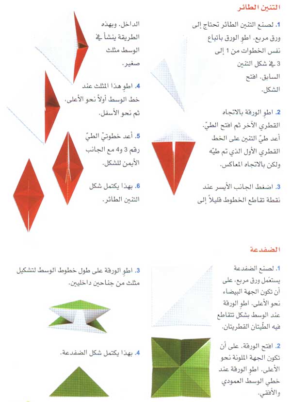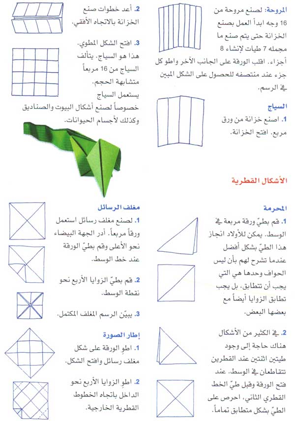 تمرّن على صنع الأشكال الأساسية مع الأولاد و اصنع منها أشياء كثيرة. قم بطيّ البطاقات و المغلفات و أطر الصور، فهذا يعطيك الكثير من إمكانيات الإستعمال. دع التنين يصعد، و طواحين الهواء تبرم ! قم بطيّ الأشكال الأساسية المعقدة من الورق الشفاف و رتبها لصنع فسيفساء ملونة على النافذة.