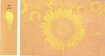 نبدأ بالأصفر الليموني الذي نبسطه بنفس الطريقة على كل الزهور. نحرص على أن نرسم جيداً شكل كل بتلة من بتلات الزهرة الموجودة في المستوى الأول. و بالمقابل، يمكننا الإكتفاء برسم دوائر صفراء لزهور دوّار الشمس الموجودة على السطح الخلفي. و سنلاحظ أننا إخترنا ورق رسم لونه أبيض مائل للسمرة "بيج"، لأنه يتناسق جيداً مع الأصفر ويضعفه.