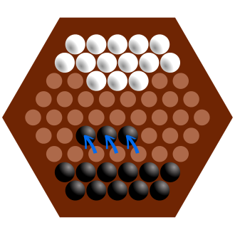 2- في كل حركة يستطيع اللاعب تحريك حجر واحد في الإتجاهات الأفقية أو القطرية، أو اثنان أو ثلاثة أحجار دفعة واحدة حركة واحدة فقط.