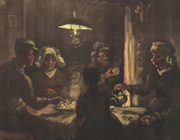 أخذ فان غوغ عدة رسمه الخاصة وخرج بها الى الطبيعة, رسم الحقول والمنازل وكانت لوحاته على الرغم من أنها مفعمة بالحياة, قاتمة وحزينة كلوحة " أكلة البطاطا" التي رسمها وصوّر فيها عائلة من الفلاحين تجلس حول مائدة الطعام تحت نور خافت يتناولون بضع حبات بطاط, وأراد أن يظهر قيمة العمال وتعبهم لتحصيل لقمة العيش.