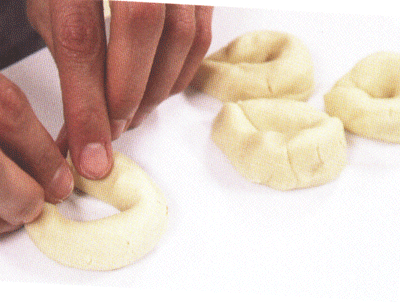 3- نضع القطع المشكلة داخل صينية مدهونة بالزبدة في الرف الوسطي للفرن على درجة حرارة 180 درجة مئوية لمدة 7 الى 10 دقائق حتى تتلون من الأسفل ثم نخرج الصينية من الفرن.
