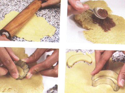 5- نمد العجينة على الطاولة بواسطة الشوبك ثم نقطعها مستخدمين القواطع الخاصة بالبسكويت ذات الأشكال الجميلة.