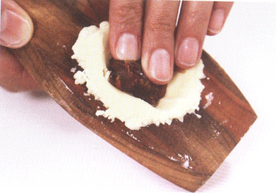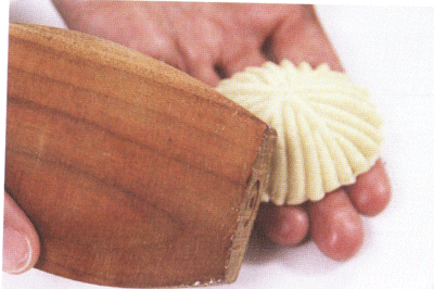 3- نشكل أقراص المعمول مستخدمين القالب الخاص بها ثم نحشيها بالتمر