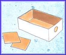 1. نحدث ثقباً في أحد الجانبين الصغيرين لعلبة الأحذية، ثم نقص نربعين من الكرتون أصغر بقليل من عرض العلبة.