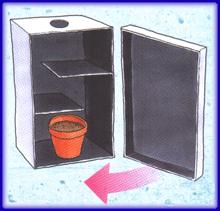 3. نملأ وعاء الزهور بالتربة أو خليط الأسمدة ونزرع فيه حبة الفاصولياء، ثم نسقيها بكمية وافرة من الماء ونضعها داخل علبة الأحذية ونغلق الغطاء.
