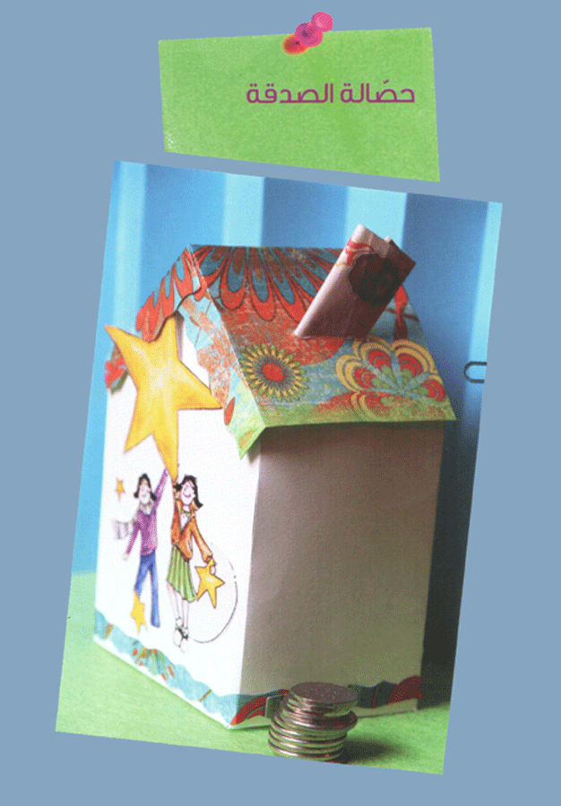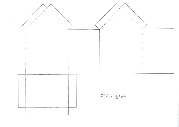 1. نقص الخطوط المستقيمة المبينة على نموذج الحصالة (القجة) المرفق، ونعيد رسمه على الورق المقوى، مستخدمين قلم الرصاص والمسطرة، ثم نقص الورق المقوى (لا ننسى أن ننسخ الخطوط المنقطة على الورق المقوى).