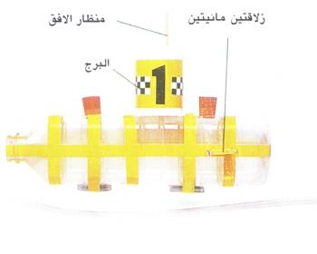 4- لصنع برج المراقبة لغواصتنا، نزيّن علبة لبن فارغة حسب رغبتنا، ونفتح فتحة في أسفلها و ثقباً صغيراً في جانبها، بحيث يمكن أن تمتلئ بالماء. ندخل وتداً من خلال هذا الثقب لصنع البريسكوب (منظار الأفق)، ثم نلصق العلبة بالغواصة.