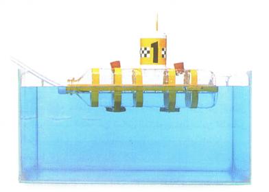 2- نثقب ثقب صغير على جانبي القنينة بالقرب من قاعدتها. ندخل وتداً صغيراً من كل ثقب. نقص قطعتين من خشب البلزا بالشكل المبين في الصورة، ثم نصبغهما. بعد ذلك نلزق هاتين الزلاقتين المائيتين بالأوتاد.