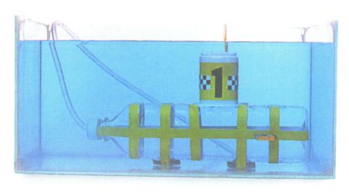 1- نضع الغواصة في الماء و السدادات فيها. و بعد أن يدخلها القليل من الماء و تبدأ بالطفوعلى سطح الماء، نوقف خروج الهواء بالضغط على فوهة الأنبوب البلاستيكي.