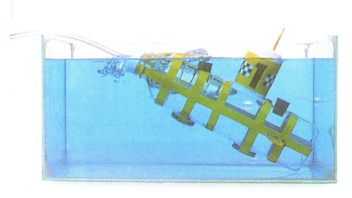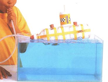 3- إذا أردنا أن نرفع الغواصة ثانيةً إلى فوق سطح الماء، نعيد السدادات إلى مواضعها حين تكون الغواصة لا تزال تحت الماء. و الآن ننفخ بقوة في الأنبوب البلاستيكي. وبما أن الهواء يطرد الماء من الغواصة