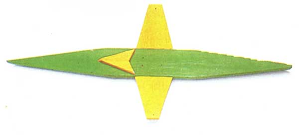 أصبغها، وحين تجف الصق القطعة "ب" عبر مركز القطعة "أ". أدخل أربعة براغي دائريةالرؤوس في الدفة، واثنين في مؤخرة البدن كما مبين في الصورة أعلاه.