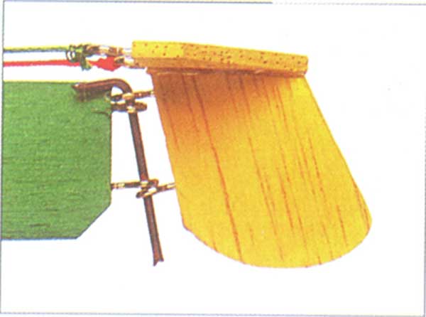 إطو نهاية سلك قوي، ثم ضع الدفة بحيث تتطابق فتحات الكلبسات الدائرية مع تلك التي على بدن القارب، ثم أدخل السلك في الفتحات ليمسكها معاً.