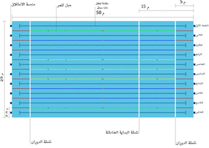 وهنالك حوض السباحة الدولي والذي تقام فيه السباقات الرسمية ويكون طوله 50 م، وعرضه 21 م، وعمقه 1.80 م.