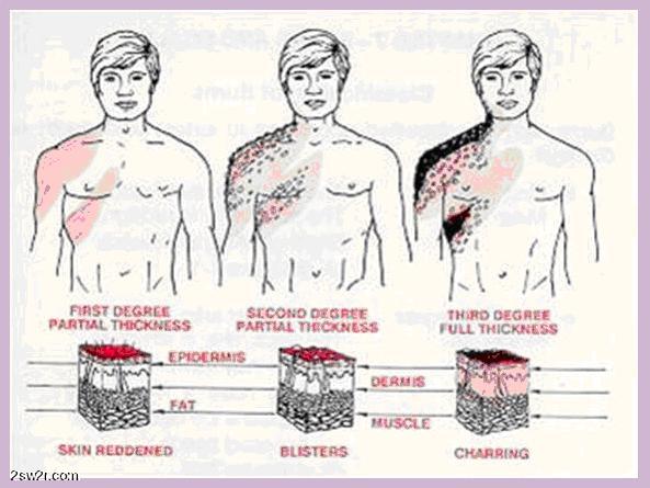 لابد من تحديد نوع الحرق ومصدره: حراري - كيميائي - كهربائي - إشعاعي - حروق الشمس.
