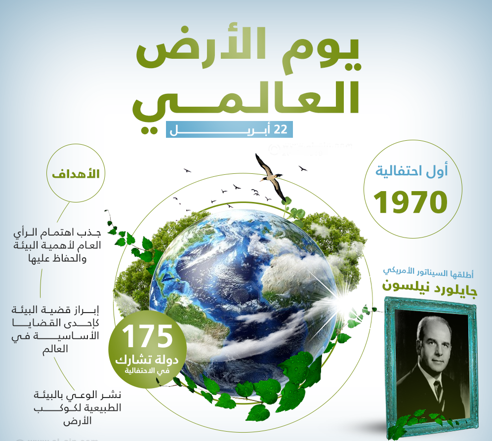 ويوم الأرض العالمي هو يوم اتفقت عليه معظم دول العالم ، لينظروا في مشاكل الكرة الأرضية التي تحملنا في ظهرها ، وفي بطنها قد جاء كنتاج لتطور وعي بيئي عالمي وتم الاحتفاء به لأول مرة عام 1970 حيث أشاد صاحب الفكرة "السناتور جاي لورد نيلسون" عن الهدف من مناسبة يوم الأرض وهو جذب اهتمام الرأي العام لأهمية البيئة والحفاظ عليها ، وإبراز قضية البيئة كإحدى القضايا الأساسية في العالم ، وقد نجح هذا حيثُ عدا يوم الأرض العالمي هو الفرصة التي أُعطيت للشعوب ، ليهتم الفادة السياسيون بقضية البيئة .