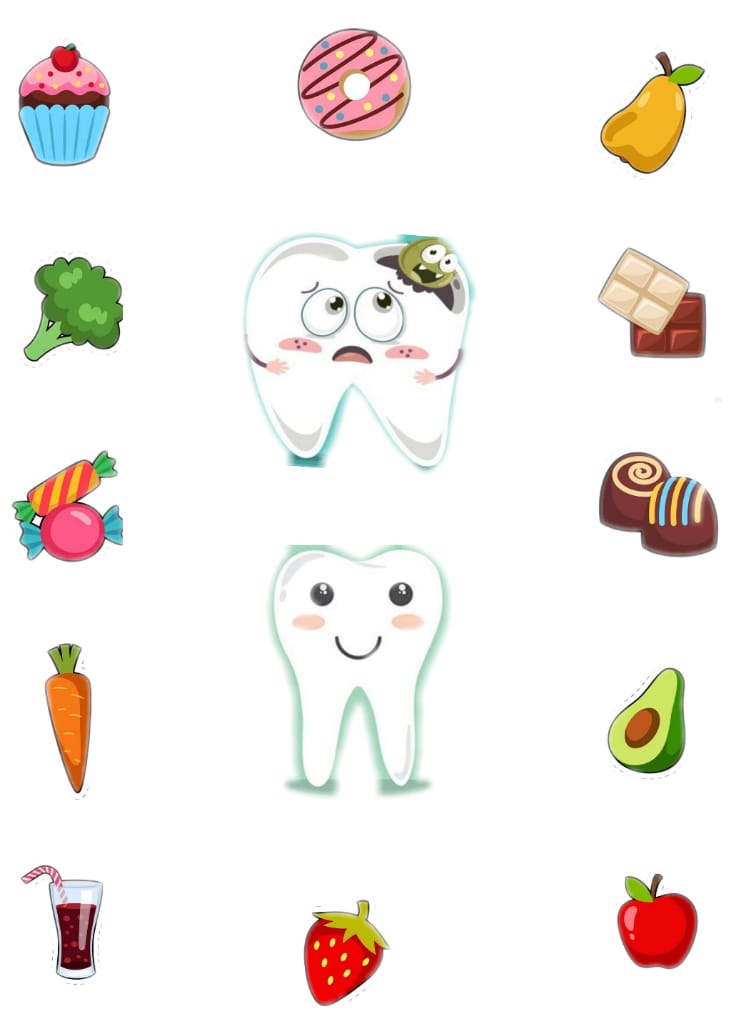 يعرض القائد صورة التمرين، ويقول للأفراد: "لآلئ صغيرة، لا يجب أن تكون حزينة. صِلْ الطعام المناسب للسنّ السليم أو السنّ المسوّس، واذكر كيف أثّر الطعام على السن؟"