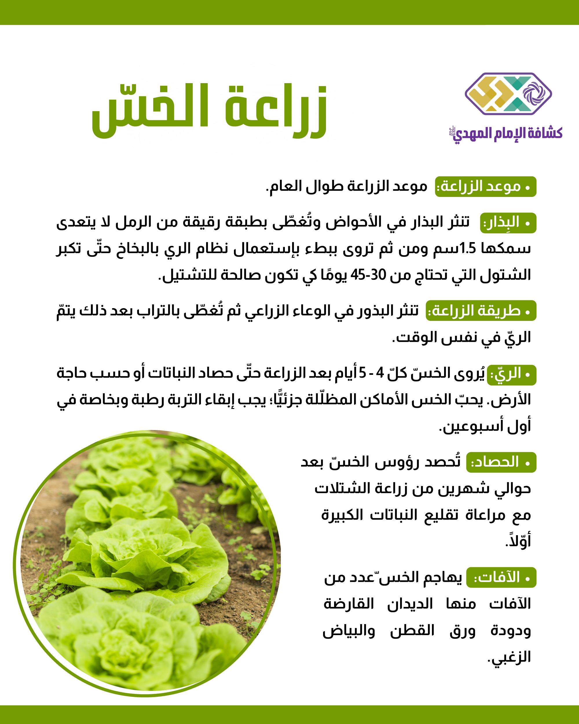 • الآفات: يهاجم الخس ّعدد من الآفات منها الديدان القارضة ودودة ورق القطن والبياض الزغبي.