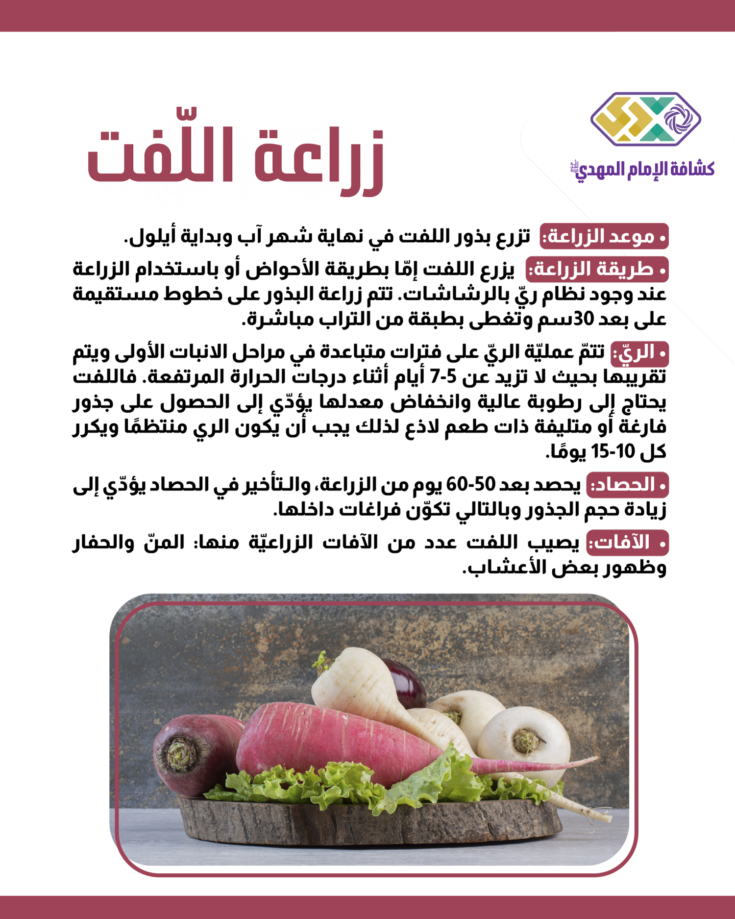 • موعد الزراعة: تزرع بذور اللفت في نهاية شهر آب وبداية أيلول.