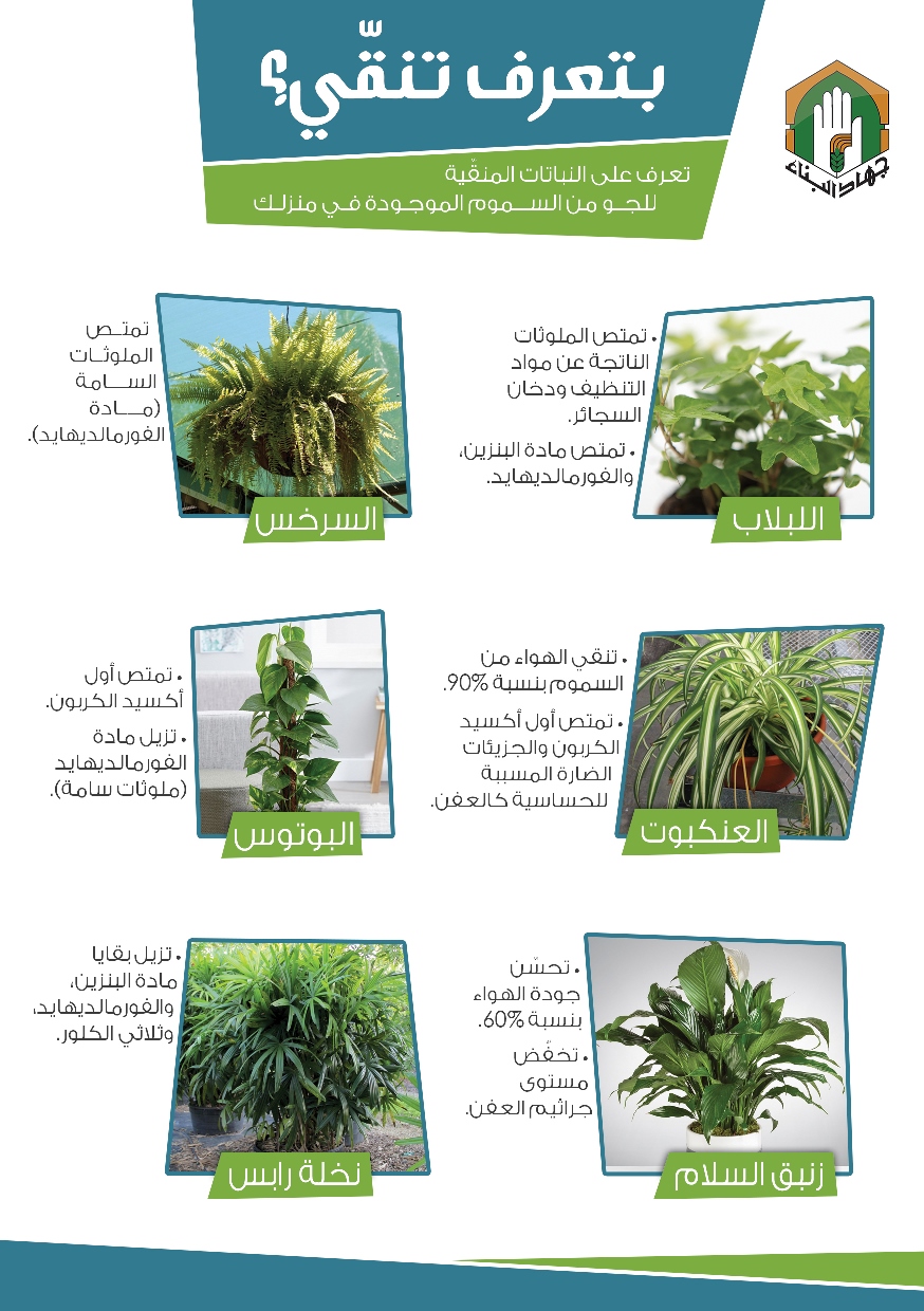 - تنظيف الهواء: تُساعد نباتات الزينة على تنقية الهواء داخل المنازل وجعله عذبًا، وتقلّل من مستويات الملوثات مثل: أول أوكسيد الكربون، والفورمالدهايد، والبنزين، وثلاثي كلور الإيثيلين التي تمتلىء بها المنازل بسبب مصادر الطاقة المختلفة، بالإضافة إلى مساهمتها في إعادة تدوير ثاني أكسيد الكربون من خلال عملية التمثيل الضوئي.