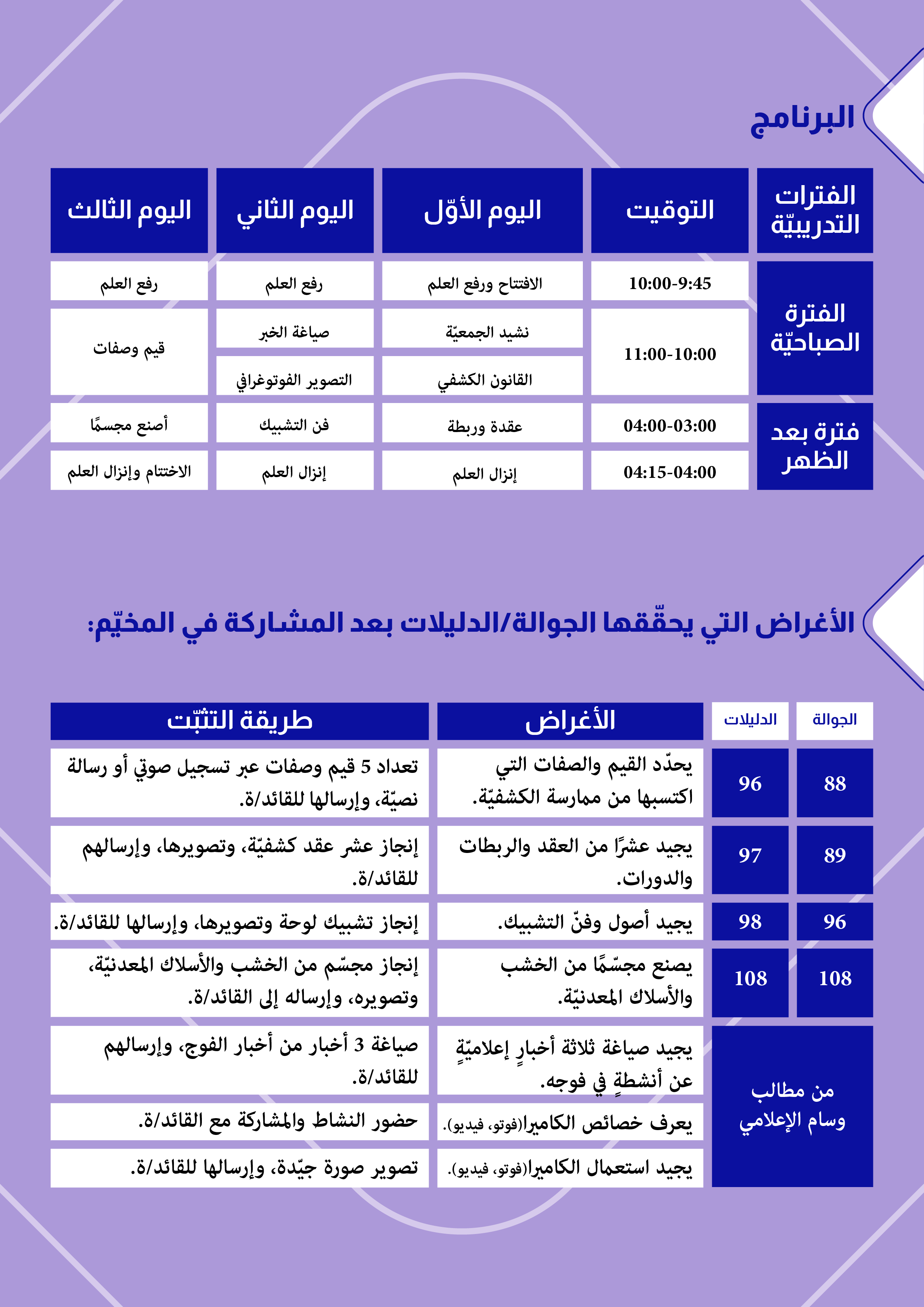 8- اضفاء الأجواء الكشفيّة والتنافسيّة في المخيم: ترديد صرخات كشفيّة (بالحدّ الأدنى صرخة كلّ فترة تدريبيّة)، تقديم الألعاب الكشفيّة (بالحدّ الأدنى لعبة يوميًّا)، إجراء مسابقات،...