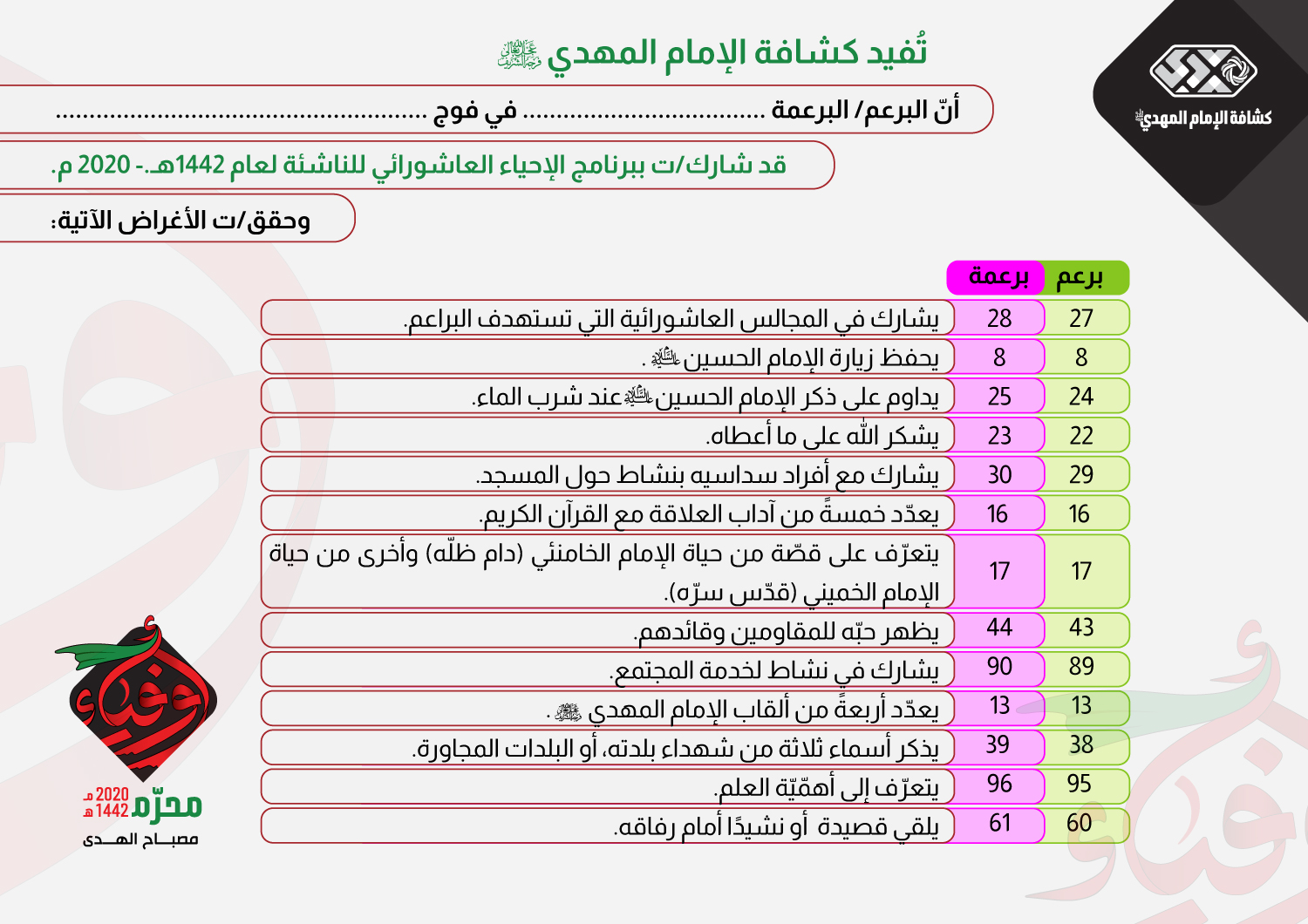 ويعلن أيضًا عن أسماء المشاركين الذي حققوا أغراضًا في سجل التقدّم خلال الإحياء العاشورائي، مثال: بطاقة أسماء المشاركين الذين حققوا الأغراض: