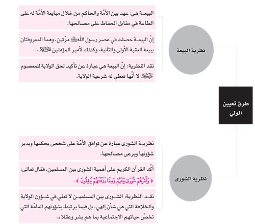 ونعرض فيما يأتي لنظريّتين من النظريات، يليها في الدرس التالي عرض لنظريتين أخريين، وهذه النظريات هي نظرية البيعة ونظرية الشورى ونظرية التصدّي ونظرية الانتخاب، مع مناقشة هذه النظريات للتوصّل إلى حلّ يتناسب مع المبادئ والأهداف.